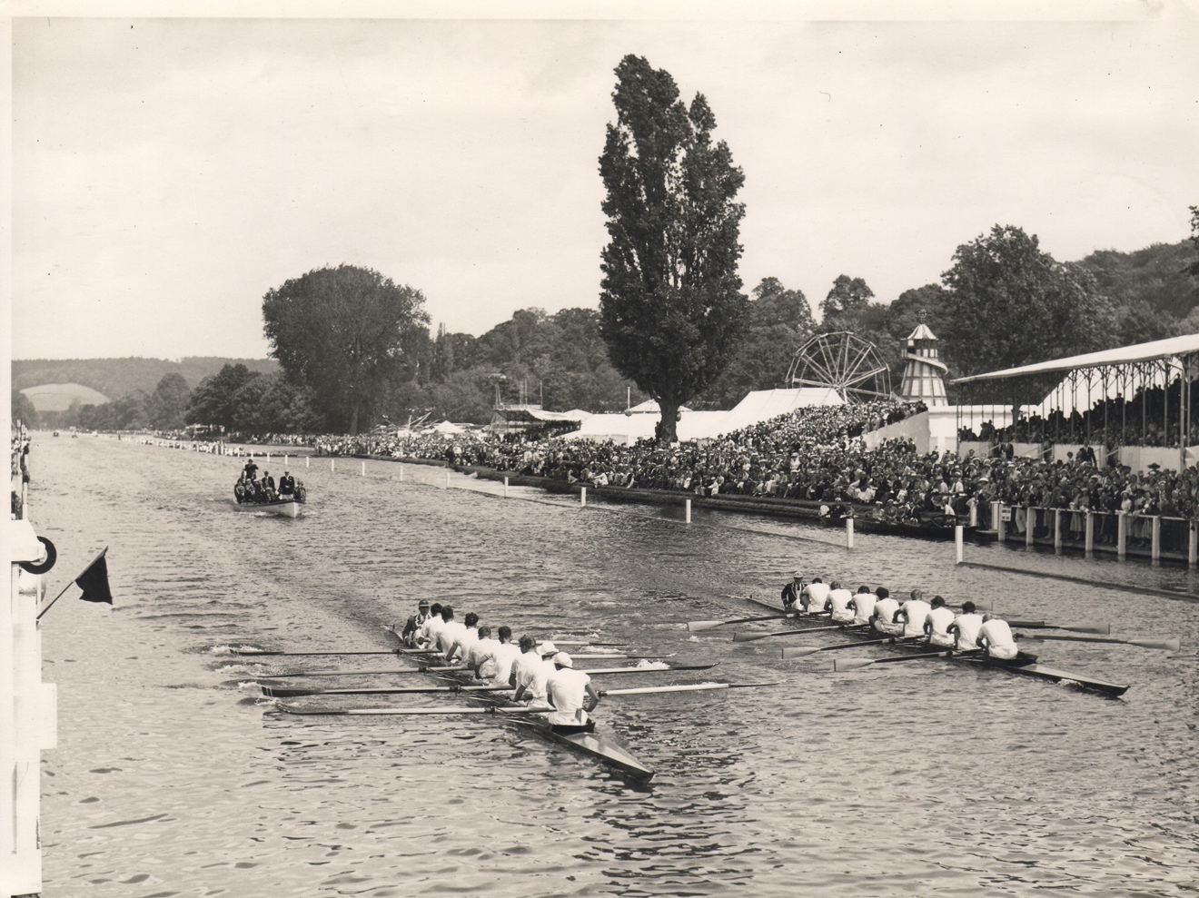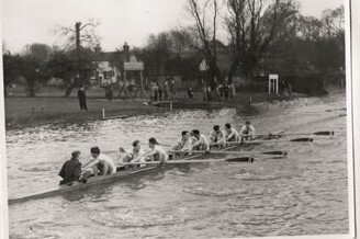 We were up a few feet at Fawley and half a length at the mile post (Times report) - well in control but still having to work hard. Passing the enclosures and the Phyllis Court wall, a freak gust of wind bent the tops of the trees on the Berkshire side. Our cox, Pilot Officer David Bright, yes he was a real pilot, was experienced in such matters. He anticipated the effect the wind would have and turned towards the gust. Nevertheless, when it hit, we were swept willy-nilly onto the booms. Martin, at 7, had to drive his blade deep into the water, taking a stroke under the boom. Magdalene didn’t have so severe a problem, blown across as we were but at least in open water.