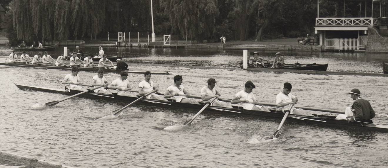 Back on the Henley reach, Tom set about correcting our start, with some success - enough to make us at least respectable. That was demonstrated the day Charles Rew, our coach from the year before, asked us to join his London crew, entered in the Grand, down at the start for a bit of a short contest. Suitably lined up and thinking ahead to when we would be doing this in earnest, we took off well and quickly established a lead. When we easied at the Barrier, it was to hear Charles say in a rather gruff voice “Well done, Peterhouse. London … go back and do it again.” We felt for London, but were somewhat reassured. (Charles’ crew reached the semi-finals in the Grand, losing to a Swedish entry after leading them at the Barrier and Fawley.)